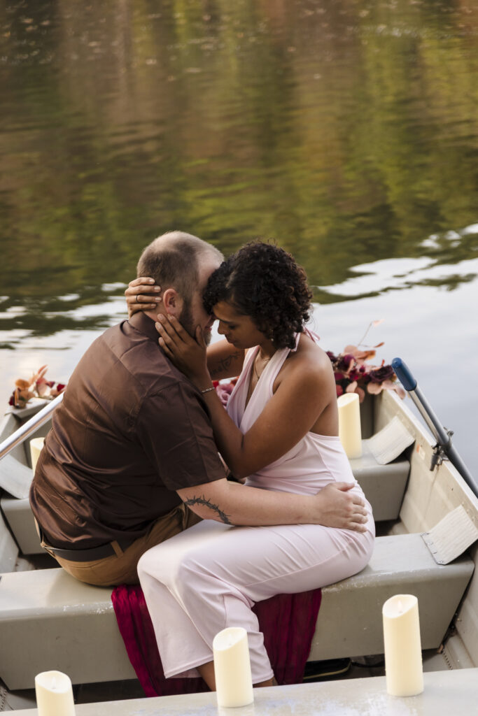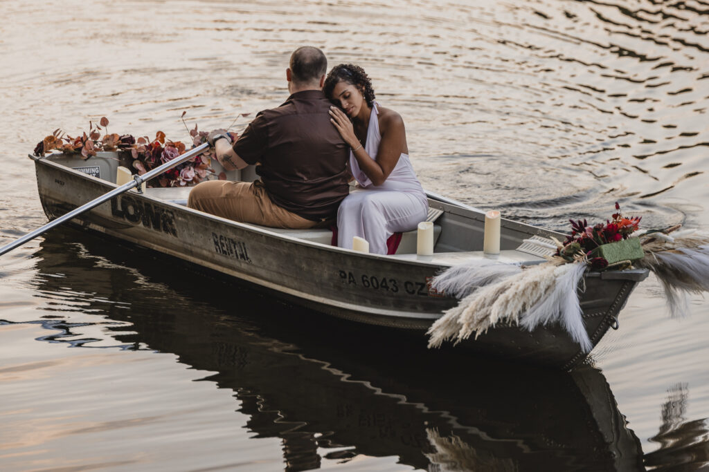Embrace on the water as the sun sets.